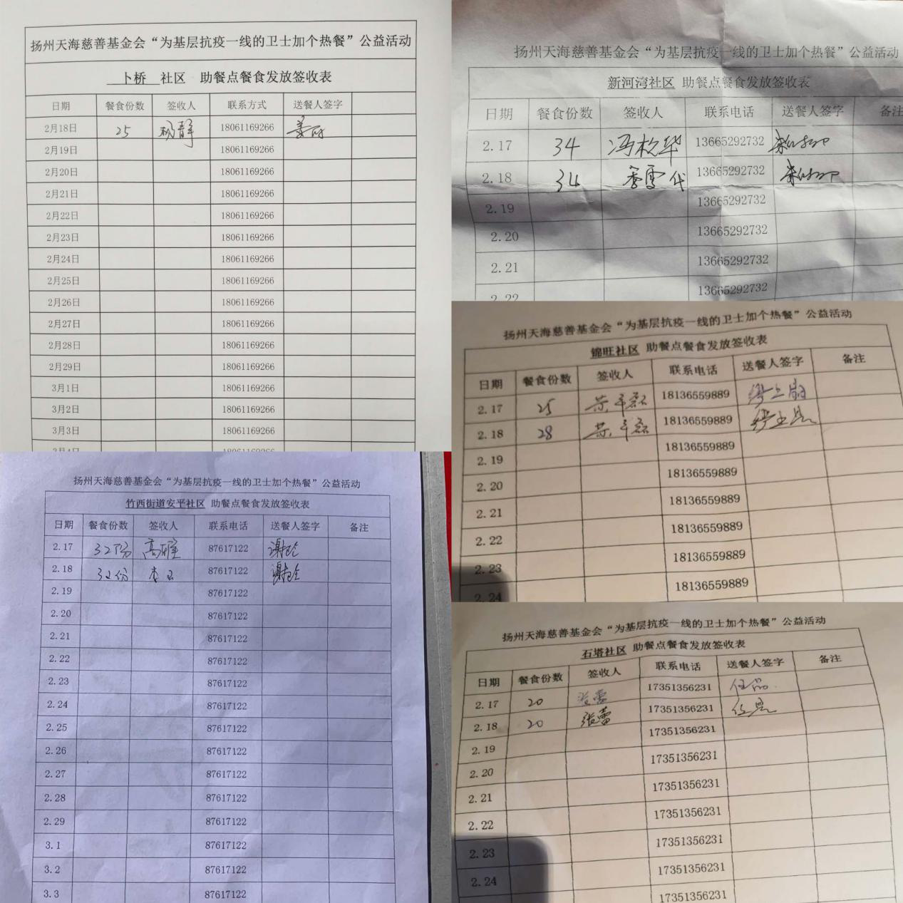 扬州天海慈善基金会为卜桥社区赠餐25份,为石塔社区赠餐20份、新河湾社区赠餐34份,为锦旺社区赠餐28份,为安平社区赠餐32份。共赠餐139份,共支出费用4084元