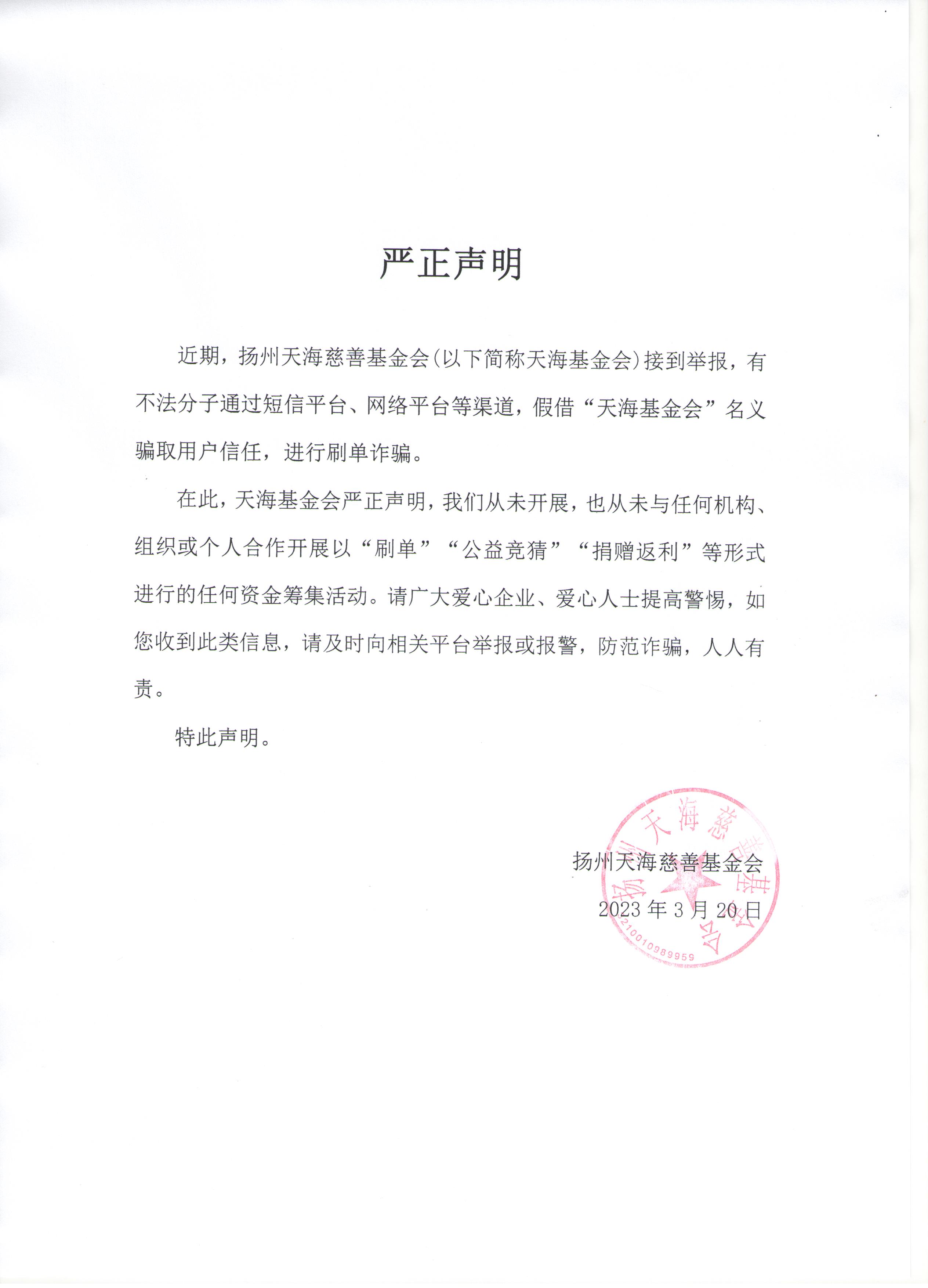 扬州天海慈善基金会是2014年10月经扬州市民政局批准成立并登记注册,由民政局主管的基金会。2017年9月,基金会申请成为4A级慈善组织;2019年12月获得慈善组织公开募捐资格。天海基金会以搭建专业透明的公益平台,专注于弱势群体教育、社区社会组织培育、老年服务、青少年帮扶等领域,致力于成为中国公益的推动者。基金会弘扬中华民族的传统美德,倡导团结互助、关爱奉献的慈善精神,增进社会各阶层之间的理解和交流,促进社会和谐。