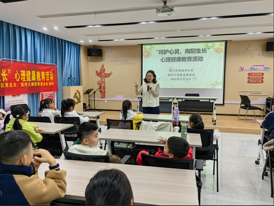 为提升少年儿童心理健康水平,增强少年儿童的心理调适能力和团队合作精神,促进其健康快乐成长,10月26日,扬州天海慈善基金会联合施井社区举办了“呵护心灵,向阳生长”心理健康教育活动。